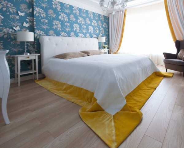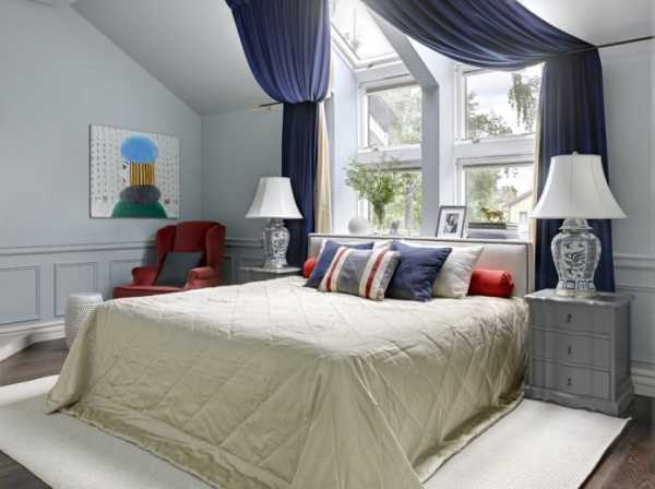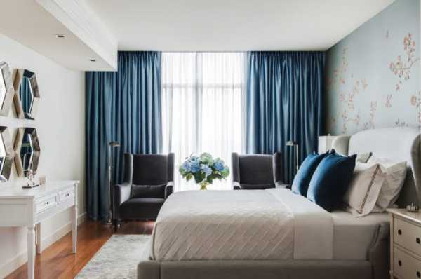 Голубые занавеси способствуют отдыху, приятны для глаз. Один из наиболее подходящих цветов для интерьера спальни, сочетается с синим, белым, золотым, коричневым.