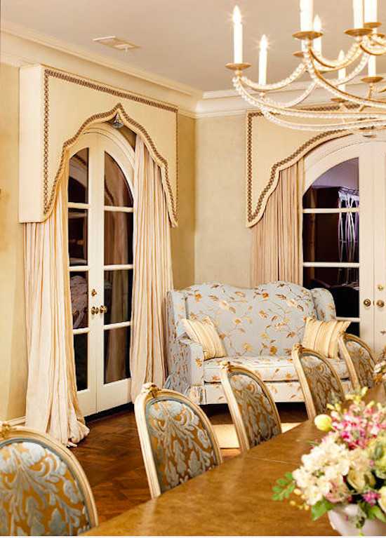 Для величественной залы больших размеров выбирают украшения из бахромы, галстуков или жабо, добиваясь этим роскоши и напыщенности.