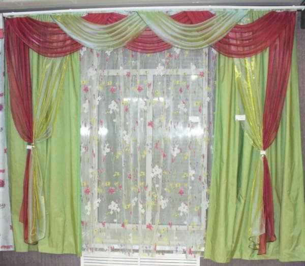 - короткая гардина, длинные портьеры и ламбрекены. Оригинальное решение с возможностью создания неповторимого оконного шедевра;