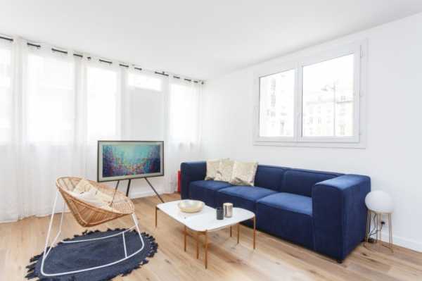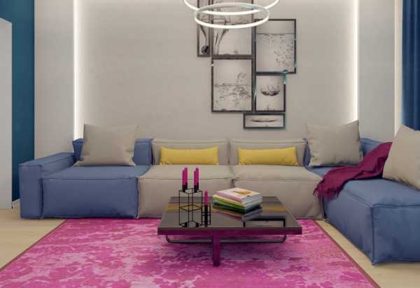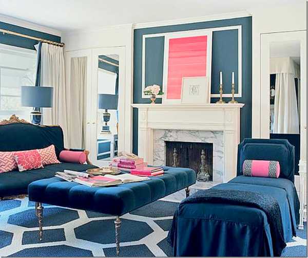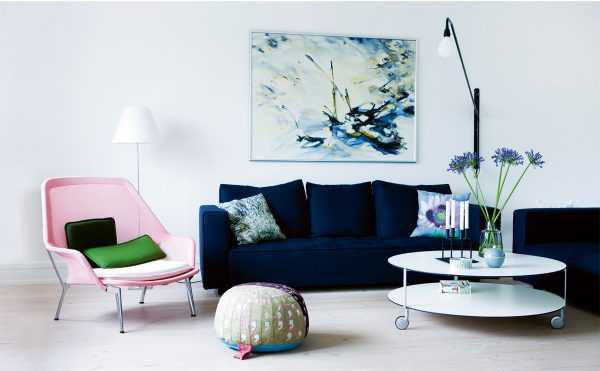 Современная светлая гостиная с темно-синим диваном и розовым креслом