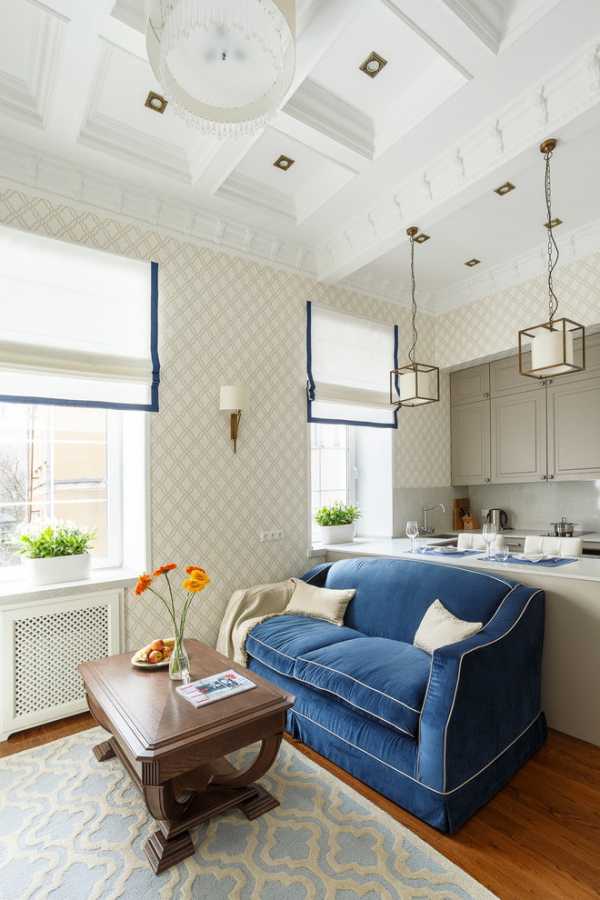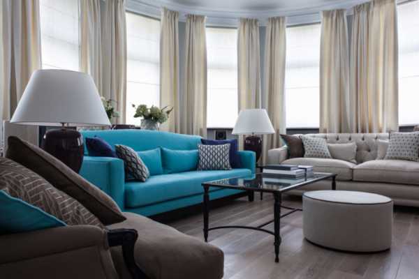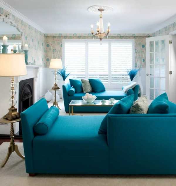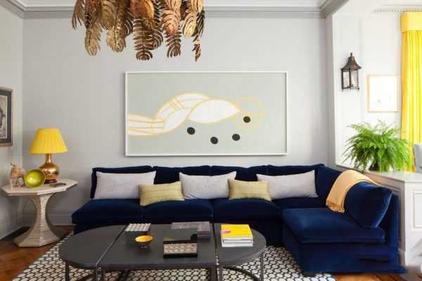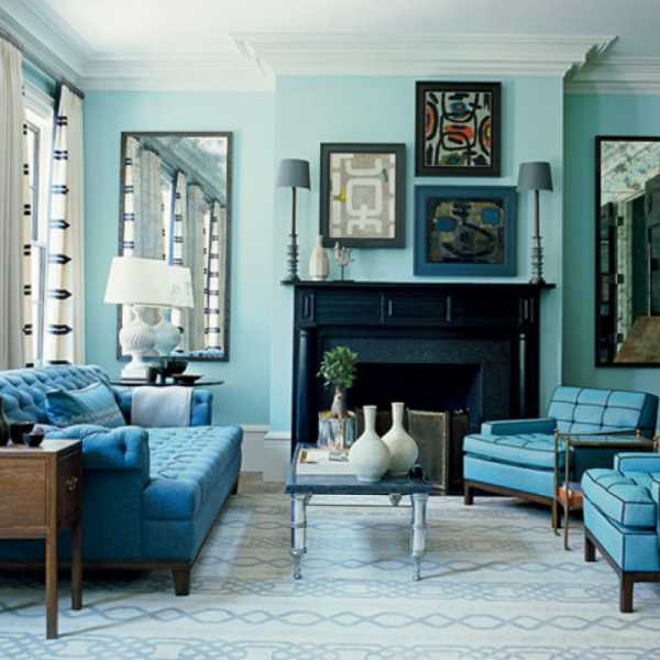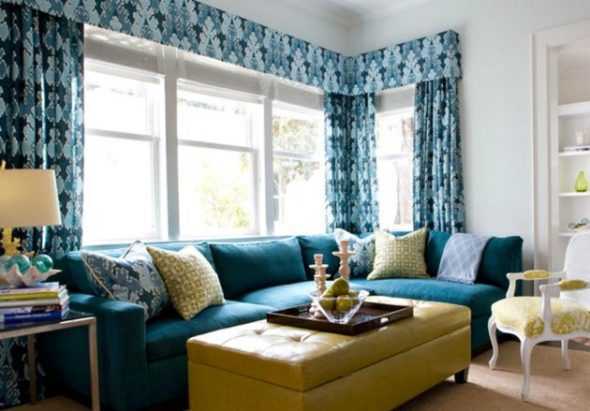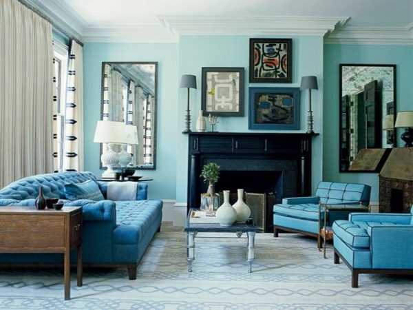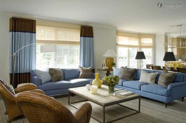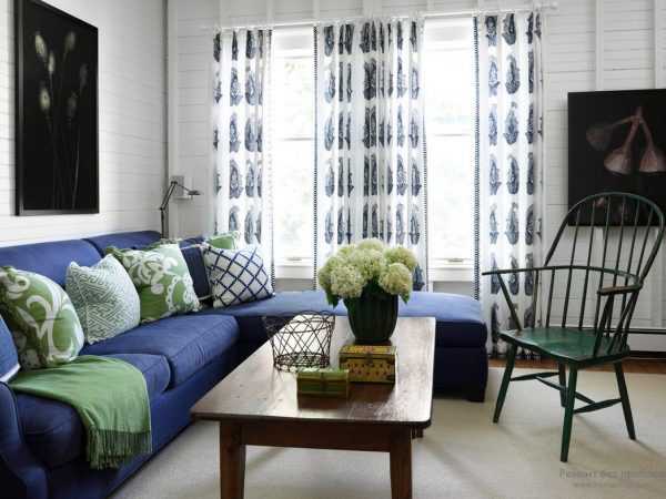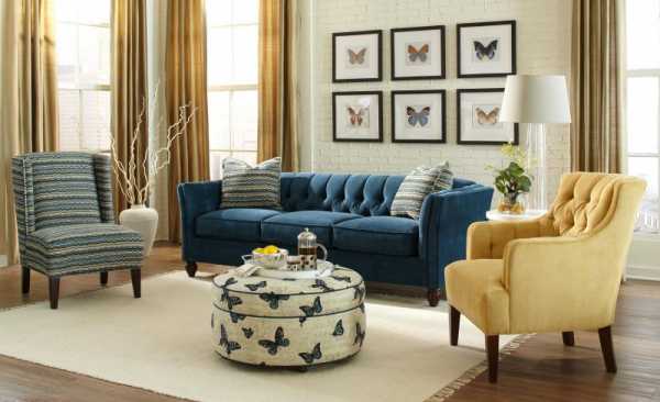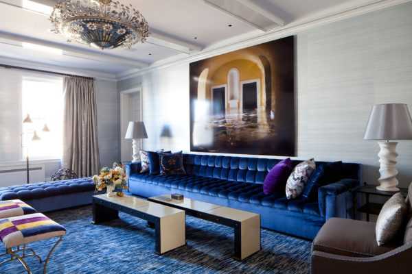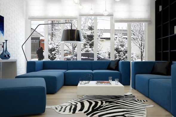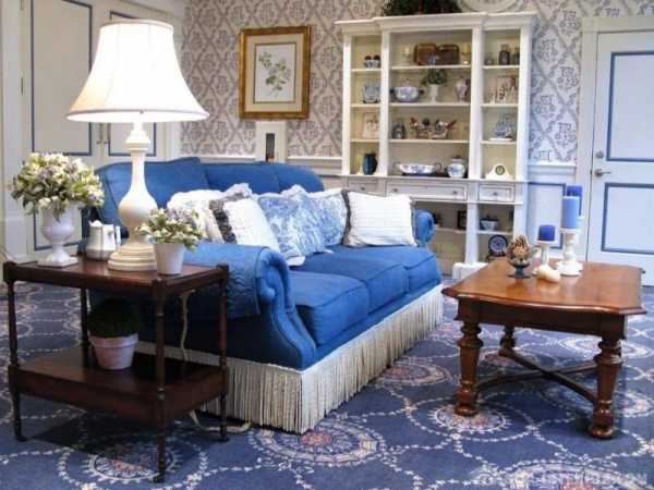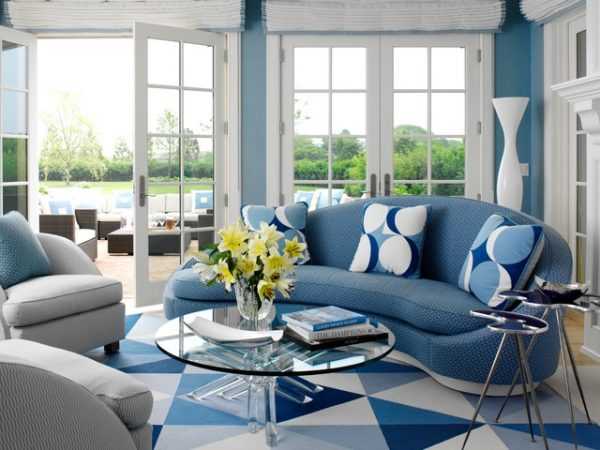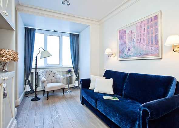 Диванчик синего цвета должен быть удобным и сочетаться с остальным интерьером гостиной. Рассмотрим несколько вариантов оформления комнаты.