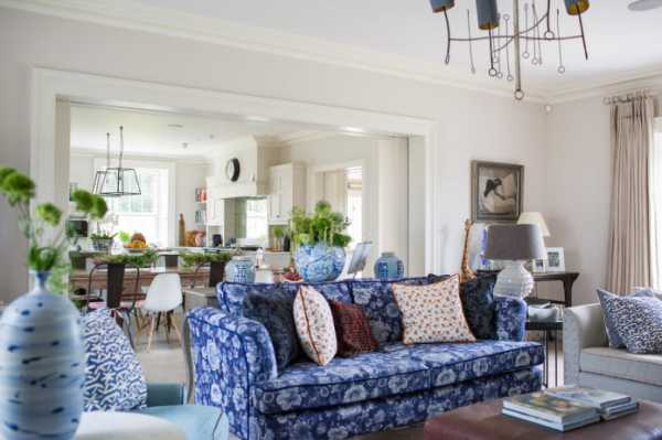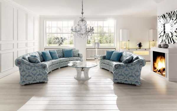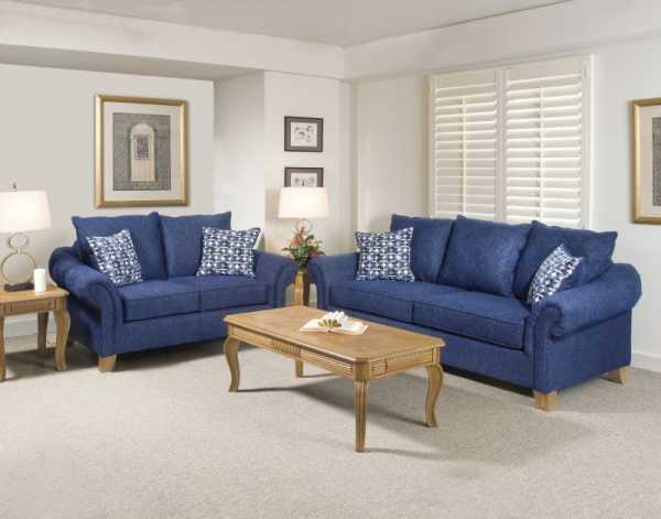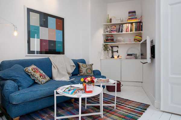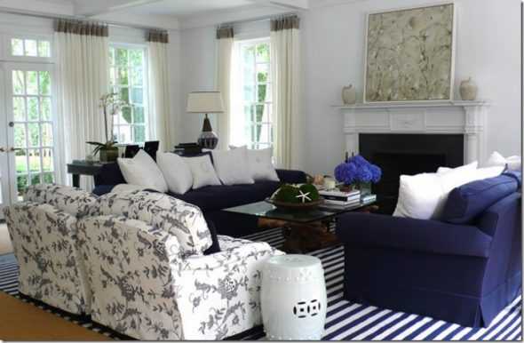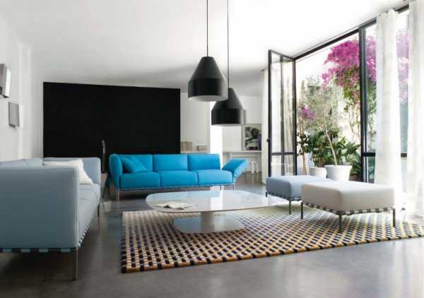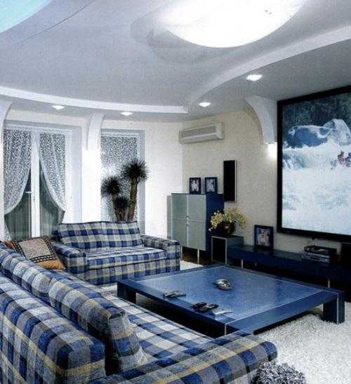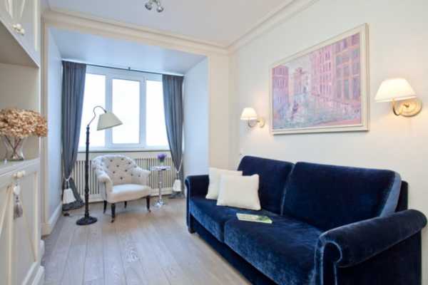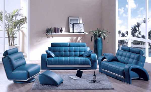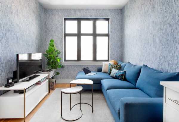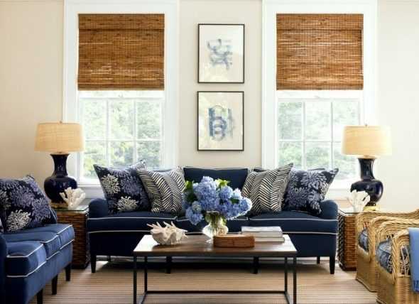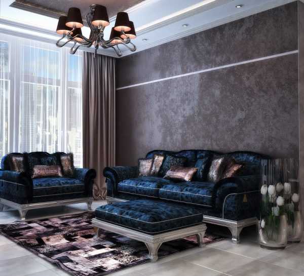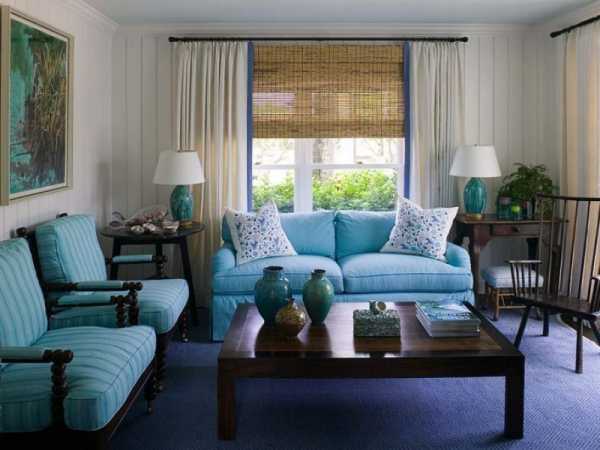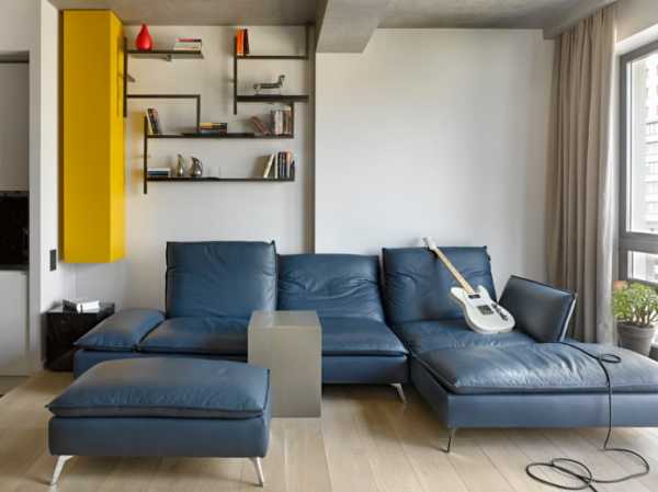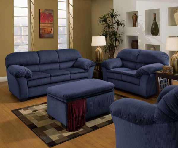 Диванчик синего цвета должен быть удобным и сочетаться с остальным интерьером гостиной. Рассмотрим несколько вариантов оформления комнаты.