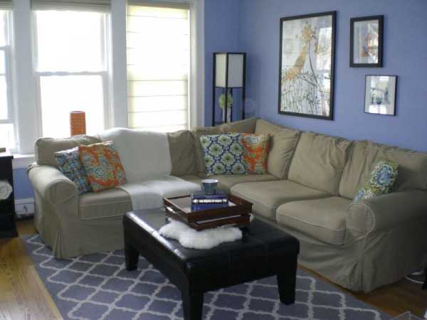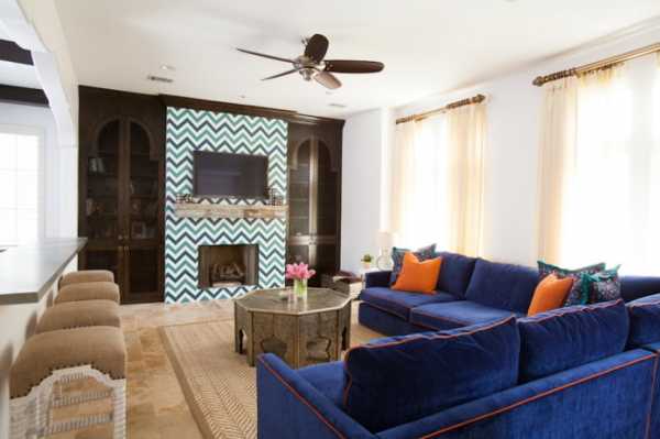 Яркая цветовая гамма. Динамично и красиво смотрится синий диван с теплыми цветами, например, оранжевым или красным.
