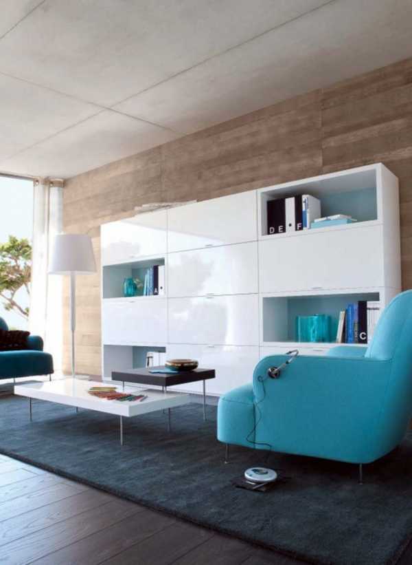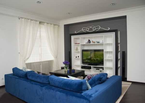 В обстановке современной комнаты лучше сочетаются стенки или отдельные корпусные шкафы. Прекрасно выглядит комплект мебели в темно-коричневых тонах или серых. С синим диваном можно поставить и разноуровневые предметы – стенку с модулем или шкаф и комод, изящную этажерку. Тумбу под телевизор лучше выбрать не квадратную, а прямоугольную.
