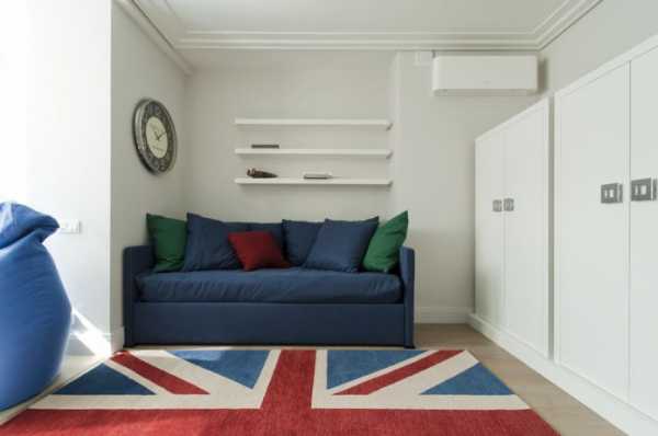 Для детской комнаты можно добавить ярко окрашенные шкафы (голубой, зеленый, сиреневый) с рисунком или шторы с мелким орнаментом. Также стоит продумать цвет и оформление обоев. Сочетание синего дивана и контрастных сюжетов из мультфильмов, геометрические фигуры и тому подобное здесь будут смотреться уместно. Не рекомендуется делать много ярких акцентов, чтобы обстановка не выглядела слишком пестрой – ребенок будет уставать от такой гаммы.