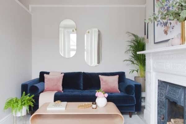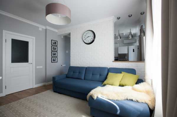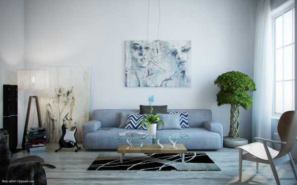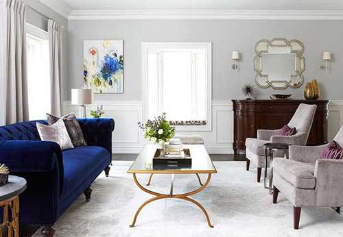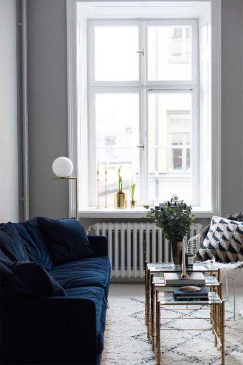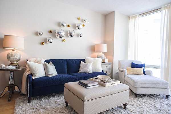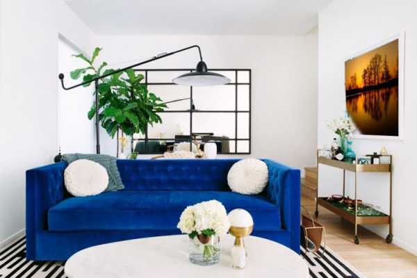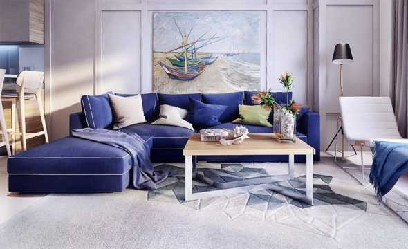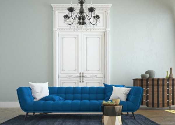 Нейтральный интерьер с ярким акцентом. Пусть основным цветом будут светлые тона, например, белые или серые. Синий диван будет оригинально и ярко выделяться среди остальной комнаты.