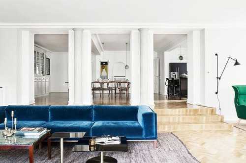 Белая комната с ярким бархатным голубым диваном с белыми круглыми подушками