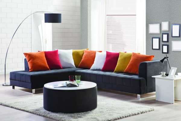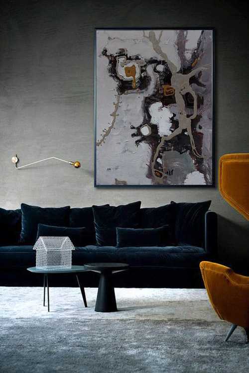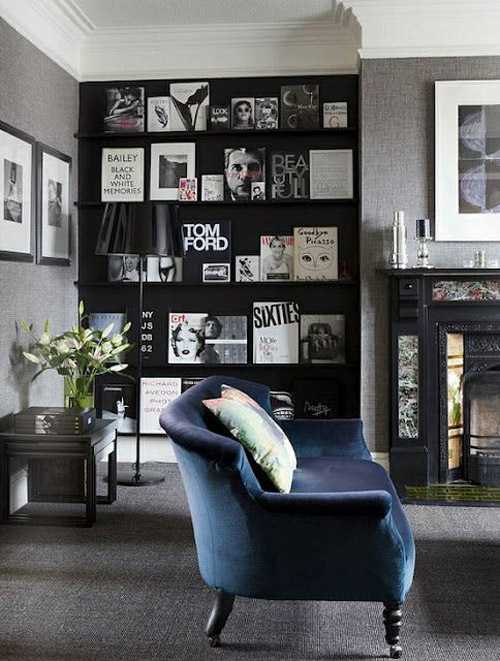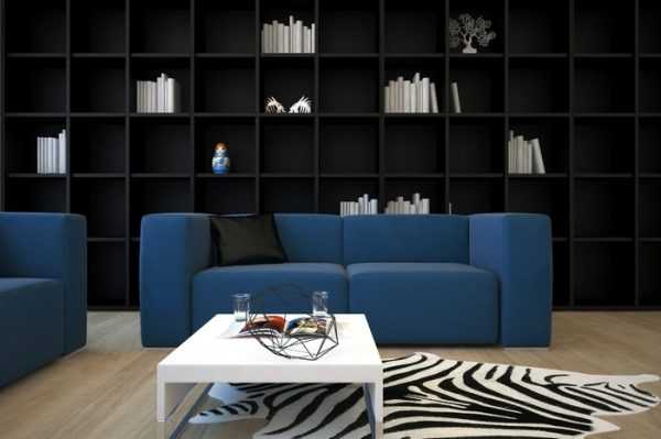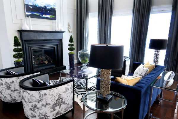 В «чёрный» цвет гостиной прекрасно впишется кобальтовый диван или темно-голубой со вставками серого. Этими вставками могут быть подлокотники, подушки или пуфики, которые приставляются к краям. Однако увлекаться чёрным не стоит. К данному цветовому элементу можно добавить несколько аксессуаров из смежной палитры. Если ограничиться только декоративными предметами, предложенное цветовое сочетание может полноценно не раскрыться.