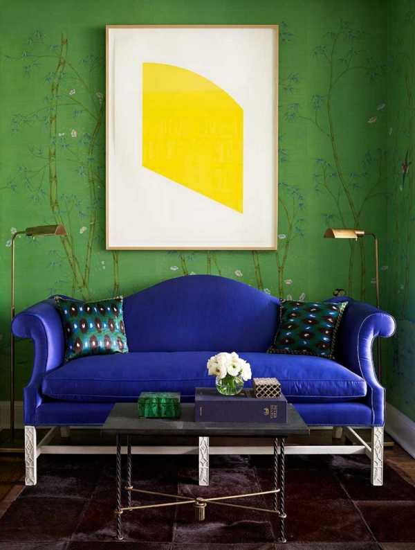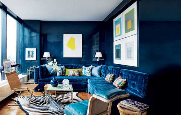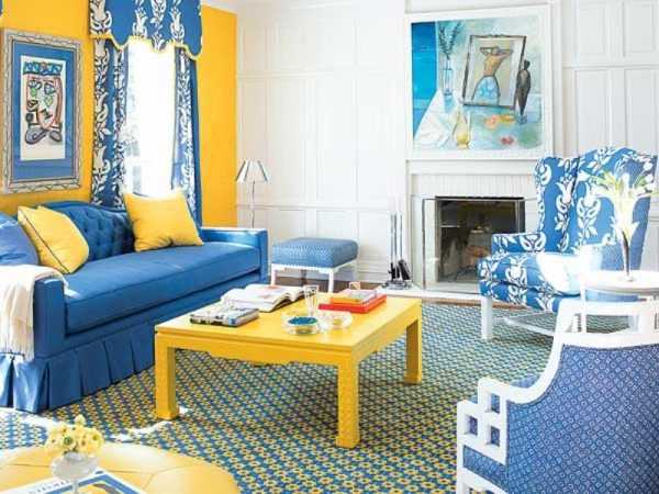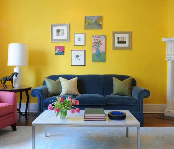 С желтым. Насыщенно-синий диван и фон цвета лимона или ванили создадут ощущение настоящего отдыха на знойном пляже. А для усиления эффекта добавьте ярких подушек.
