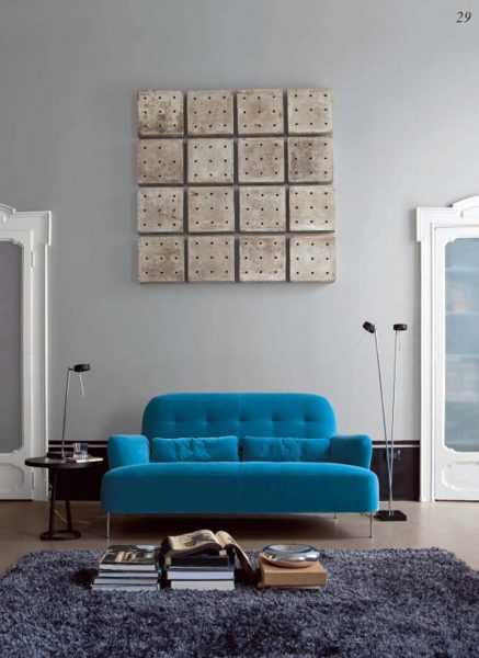 Не рекомендуется сочетание большого количества мебели. Пространство комнаты должно быть достаточно свободным. Сам оттенок обивки дивана освежает обстановку, но избыток другой мебели может визуально превалировать – на этом фоне синий цвет «потеряется».