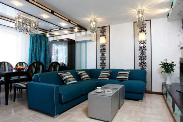 Диван синего цвета как нельзя кстати будет в гостиной.
