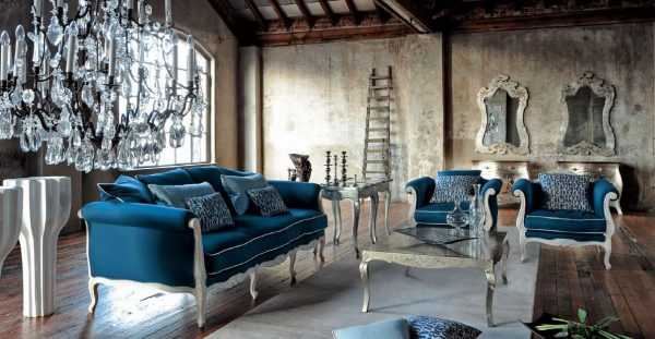 Синий диван удачно впишется в интерьер бароккового стиля с нейтральной цветовой гаммойС чем сочетается в интерьере
