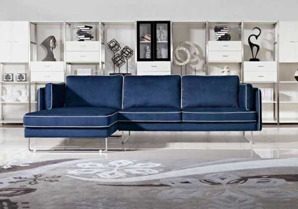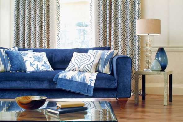 Для комнаты, где стоит синий диван, можно подобрать как гладкий материал обивки, так и бархатистый.