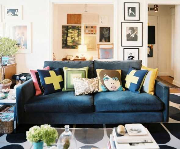 Если диван синего цвета устанавливается в гостиной, то его гамму можно разбавить контрастными акцентами. Добавьте небольшие подушки с яркой вышивкой или аппликацией с растительным или иным сюжетом, где использованы 2-3 краски. Основной фон таких изделий лучше делать в тон дивану, либо в рисунке должен присутствовать этот же цвет. Хорошо будут смотреться красный, желтый, зеленый, коричневый оттенки, если они естественны. Избегайте ярко-оранжевого, огненно-красного, фиолетового цветов в сочетании с синим.
