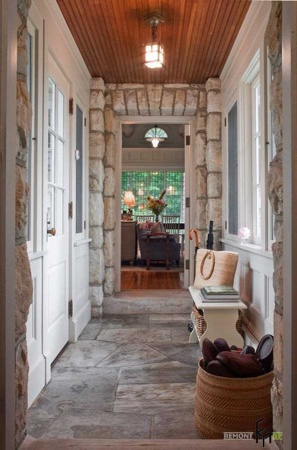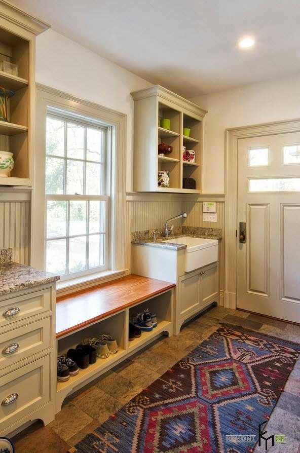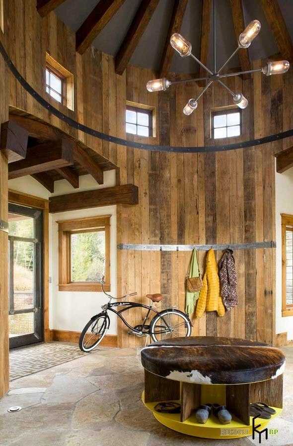 Для такой оригинальной прихожей в стиле кантри, необходима была не менее интересная система хранения обуви. Огромное круглое сидение с нишами-секторами для хранения обуви ежедневной носки, стало изюминкой этого нетривиального интерьера.