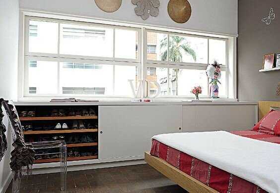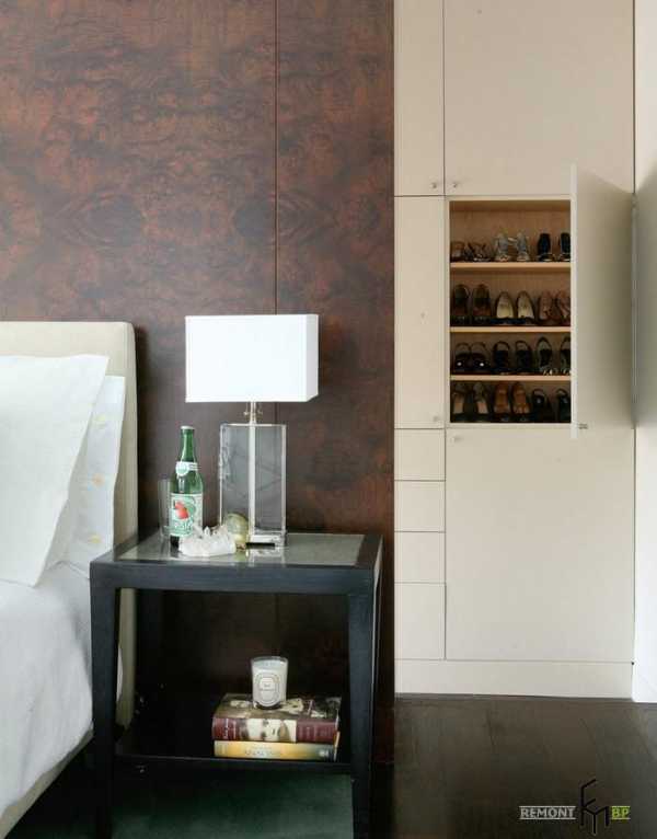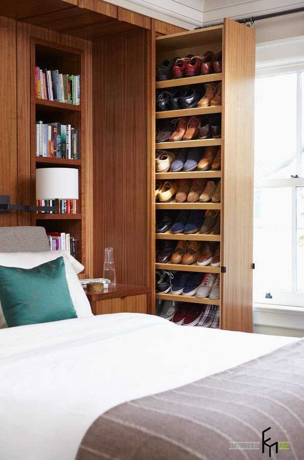 Если у вас нет возможности выделить отдельное помещение для обустройства гардеробной (что логично в условиях стандартных квартир постройки прошлого века), необходимо искать свободное пространство для систем хранения сезонной обуви в рамках личных комнат. В пространстве спальни, например, проще всего оборудовать несколько полок под обувь в шкафу, встроенном или корпусном.
