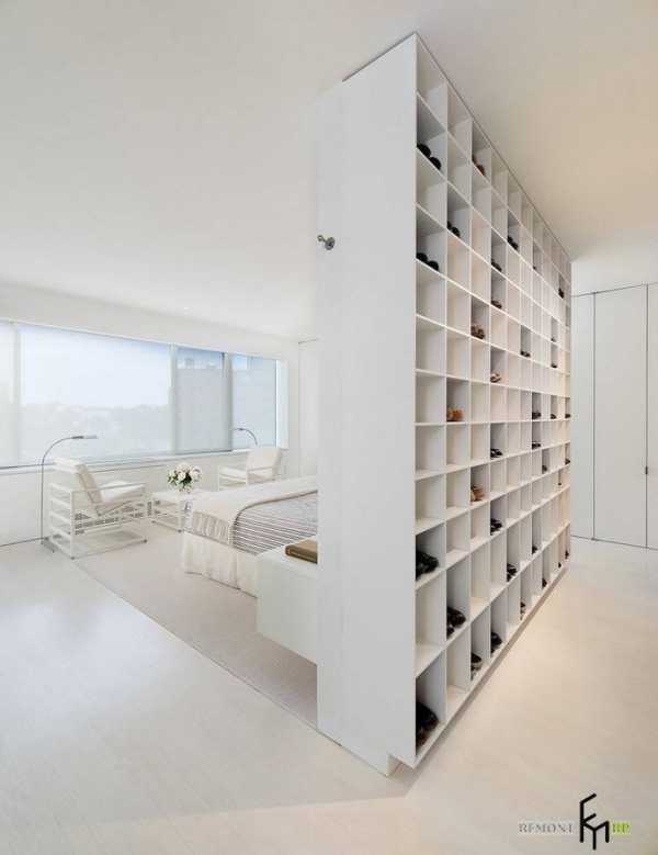 Если в вашей спальне или любой другой комнате предусмотрена ширма для разделения пространства, почему бы не оборудовать ее полками или ячейками для обуви со стороны неличного помещения? Вся обувь будет у вас под рукой, а драгоценные метры будут распределены эргономично и функционально. Ведь такой стеллаж занимает немного места в ширину, но простирается от пола до потолка и за счет этого является очень вместительным.