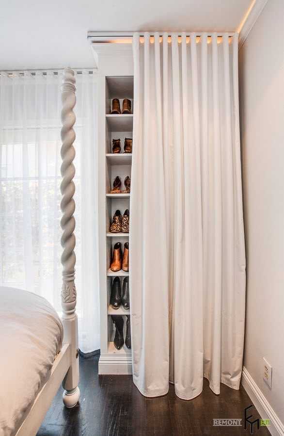 Открытые шкафы с полками для обуви можно оборудовать шторкой, которая скрывает содержимое, когда стеллажом не пользуются.