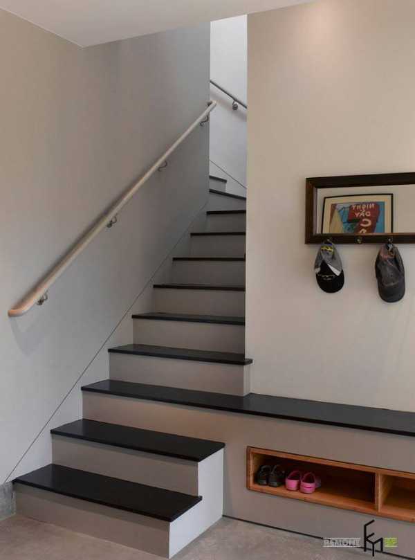 Пространство под ступенями можно переоборудовать в выдвижные ящики для обуви. Для этого лучше обратиться к специалистам, подобная работа требует точности для комфортного движения ящиков. И не забывайте о специальных «ручках», которыми будут снабжены ваши ящики. В такие системы хранения удобно убирать обувь до следующего сезона.