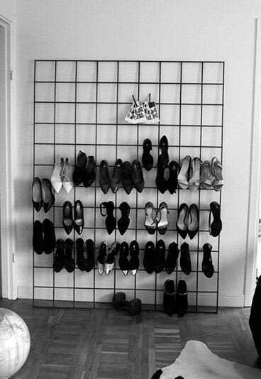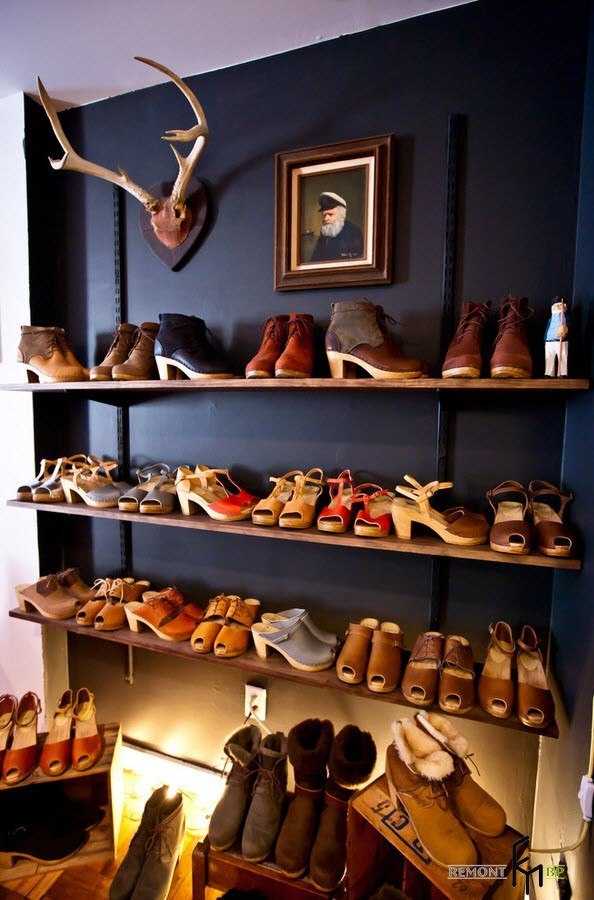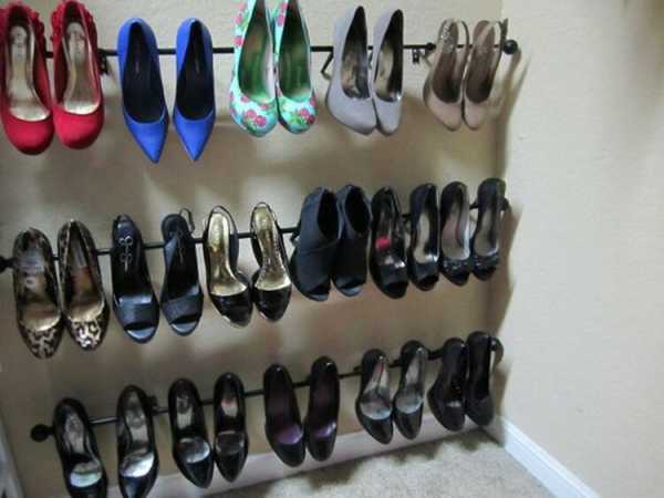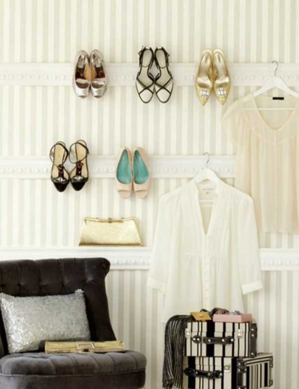 5. Обувь как экспонат. Данный способ придется по вкусу людям с творческим мышлением. Делается это так: к стене прикрепляются рейки, а на них цепляются каблуки обуви.