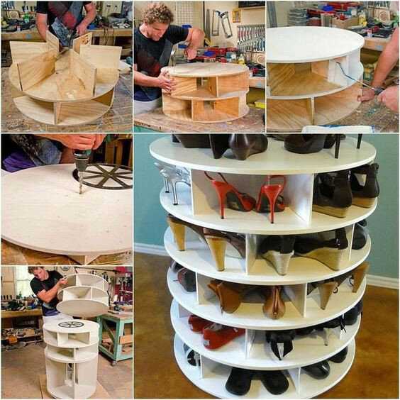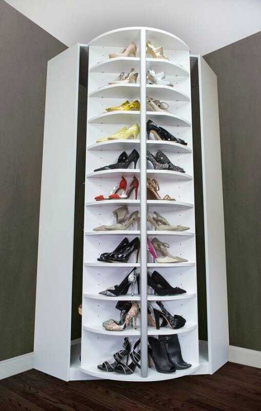 2. В такой шкаф можно встроить вращающуюся тумбу, за дверцами которого будет легко доступен весь ваш обувной арсенал.