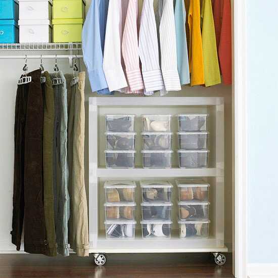 6. Всё более популярным становится способ хранения обуви в прозрачных пластиковых коробках. Он удобен тем, что Вы сразу видите где какая пара хранится, обувь защищена от пыли и деформации, а также в Вашем шкафу или гардеробе царит порядок.