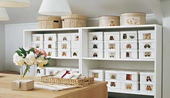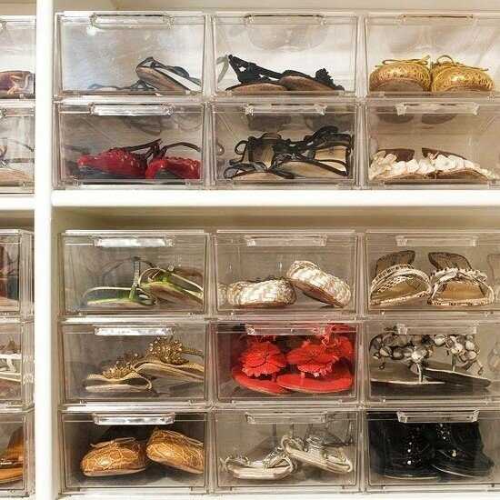 Полки или стеллажи, антресоли или гардеробная, обувь удобно хранить в коробках, по которым видно, что внутри. А это либо прозрачные контейнеры:
