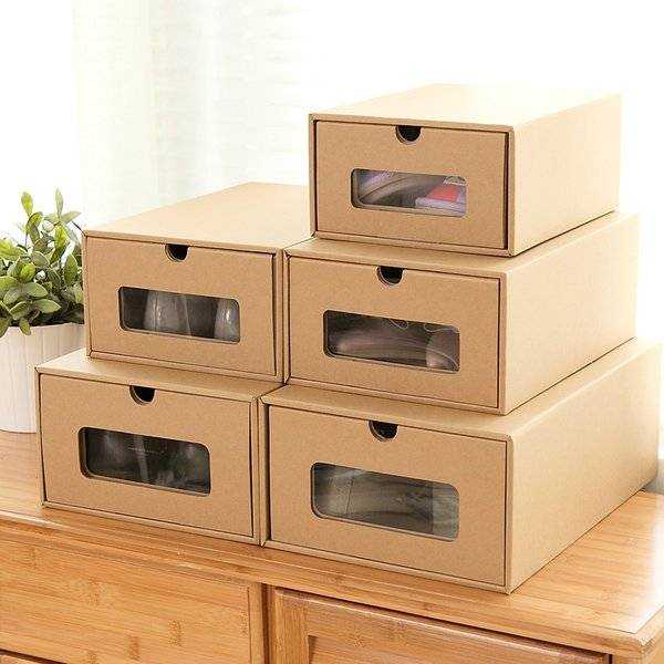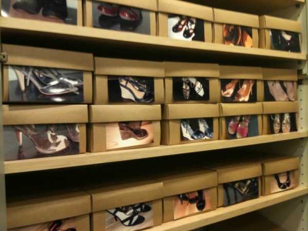 2. В картонных ящиках и коробках. Достаточно простой способ хранения, но в то же время трудный тем, что порой невозможно найти нужную коробку среди множества других одинаковых. Решить эту проблему поможет приклеивание бирок с информацией об обуви, хранящейся внутри каждой коробки.