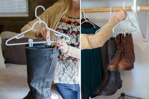 Не каждая обувь простит такое обращение (и не любая пластиковая вешалка выдержит тяжелые ботинки). Тем не менее, люди пользуются. Вдруг вам этот способ покажется удобным?