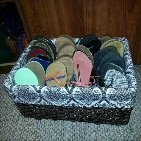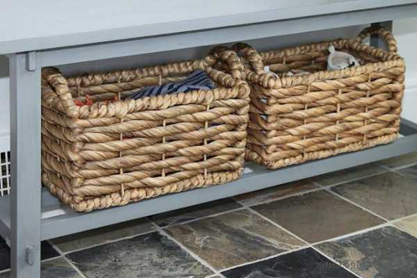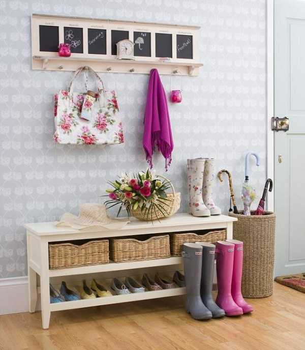 Оригинальным способом хранения обуви может послужить размещение тапочек, сланцев и других моделей обуви, которые не требуют сохранения формы, в оригинальных корзинах. Плетеные или стальные, в стиле кантри или современные пластиковые резервуары, могут стать не только практичной деталью интерьера, но и арт-объектом вашей прихожей.