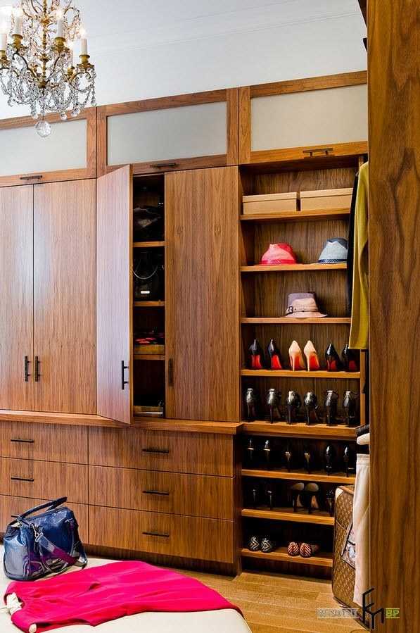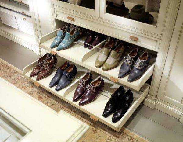 Системы выдвижных деревянных полок экономит пространство шкафов. Но при этом является достаточно вместительным хранилищем для обуви.