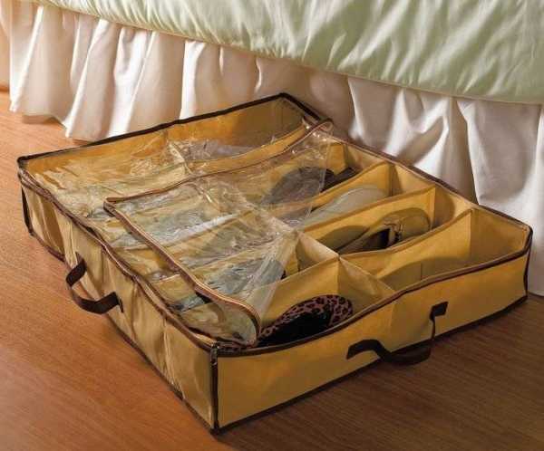 4. Хранение обуви в спальной комнате можно обеспечить в том случае, если в доме большая кровать. Организовывается подобный «склад» благодаря специальным обувным кофрам, которые располагаются под кроватью.