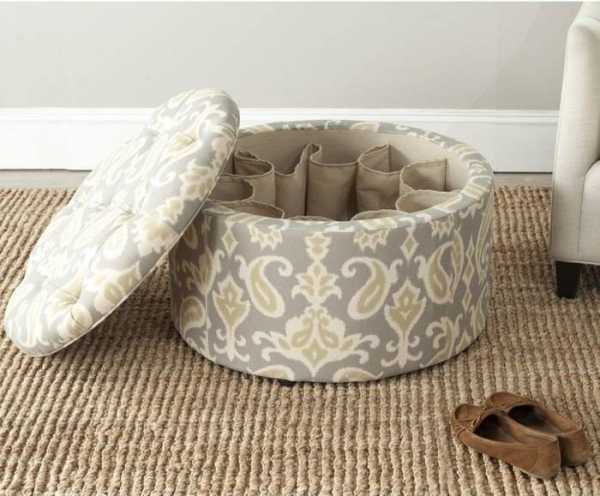1. Внутри мебели. Классический способ хранения, пользовавшийся популярностью во все времена. Например, обувь можно хранить внутри оттоманок в специально пришитых для этого карманах.