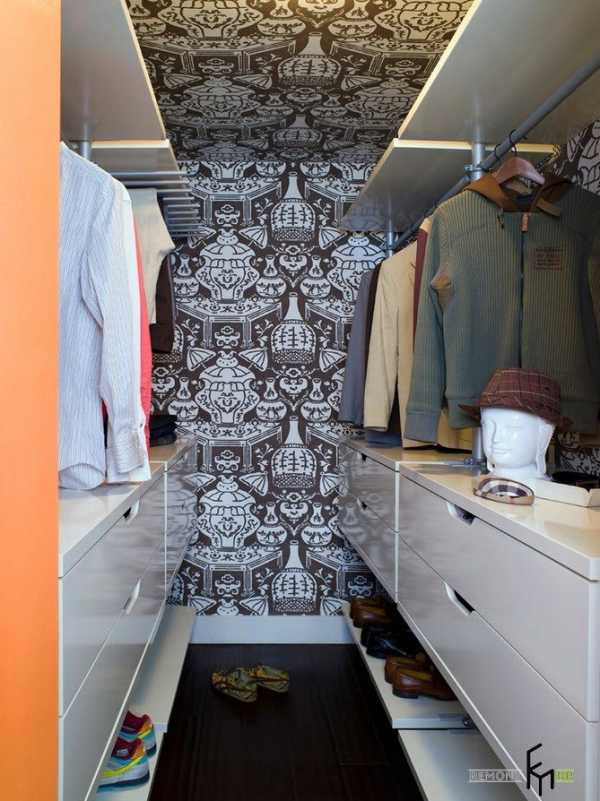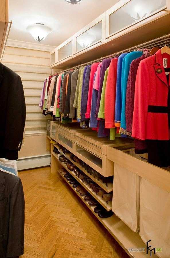 Если у вас нет возможности выделить помещение для обустройства гардеробной и даже шкаф установить некуда — не отчаивайтесь. Перед вами пример неординарных конструктивных решений по вопросам организации систем хранения. Штанга для развешивания вещей монтируется к потолку, а полки для обуви располагаются в любом доступном месте стены.