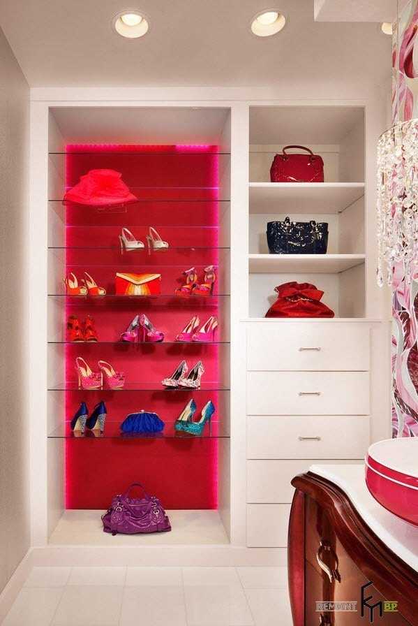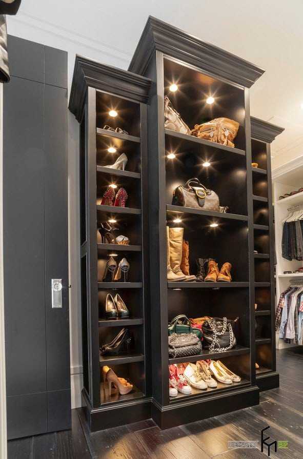Часто в гардеробных комнатах нет окон, и на систему освещения возлагается дополнительная нагрузка. В таком случае будет удобнее и практичнее помимо основного освещения в виде лампы или люстры, оборудовать систему подсветки полок с обувью и аксессуарами. Таким образом вы всегда будете уверены, что выбрали нужный оттенок или модель обуви.