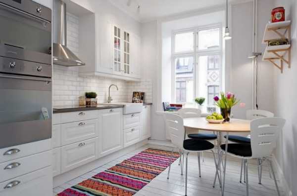 Фото 6. Совершенно белая кухня украшена цветным домотканым половиком, характерным для северных интерьеров.