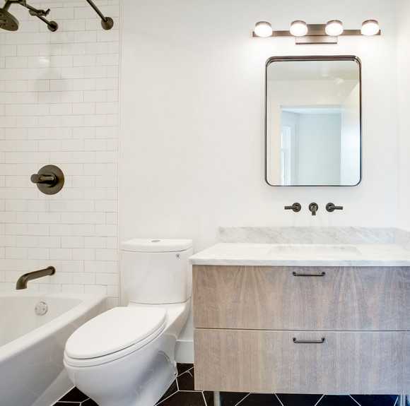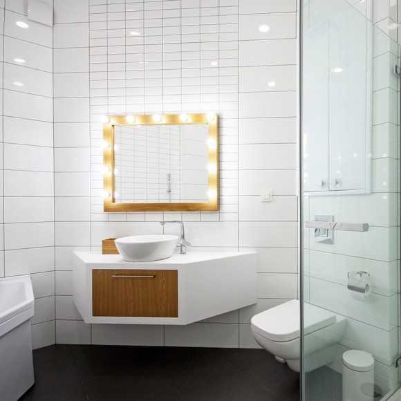 Над зеркалом вам понадобится бра или точечные светильники, или споты, для них лучше сделать отдельный выключатель — это будет удобно в использовании.