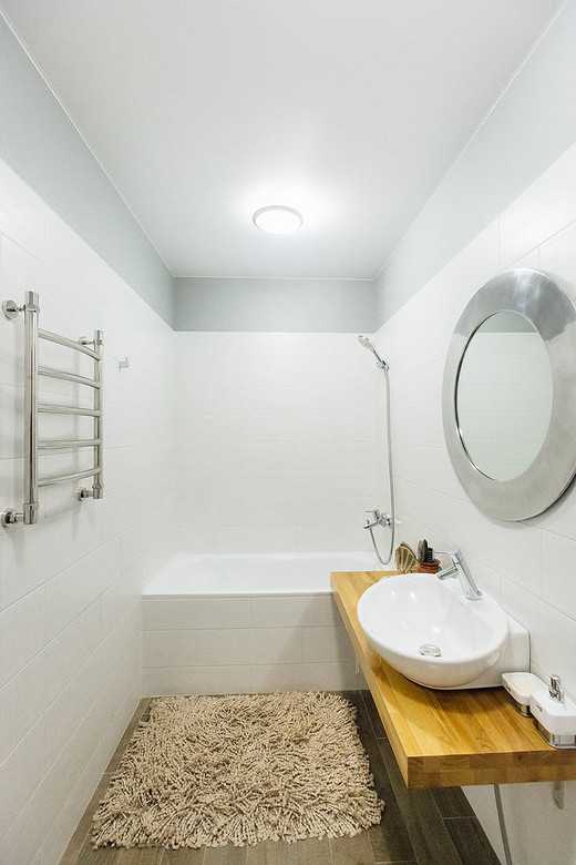 С ним все просто, делайте либо натяжной, либо просто белите. Простой белый потолок — идеальное решение для ванной комнаты и в принципе для скандинавского стиля. Натяжной же потолок может еще и защитить ваш ремонт от протечек со стороны соседей, если такие имеются.