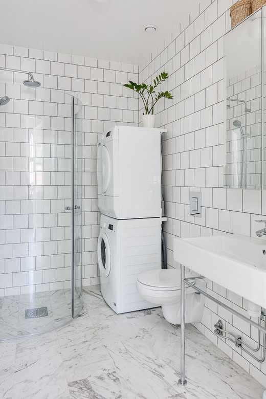 Технику тоже не требуется скрывать. Нет необходимости возводить в ванной шкаф, чтобы спрятать в нем стиральную машину и водонагреватель. Пусть будут на виду — это нормально. Техника, как и трубы, «индустриализирует» образ скандинавской ванной.