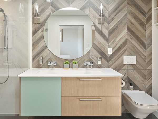 Вообще, акцент на геометрии — одна из основных особенностей стиля. Поэтому для скандинавской ванной подойдет не только классический прямоугольный, но и нетрадиционный по форме кафель: треугольники, гексагоны, ромбы, параллелограммы и др. Такая облицовка привнесёт в интерьер нордические черты. Её рисунок может вызвать ассоциации с ёлкой, снежными сугробами, снежинками, лесом, горами.