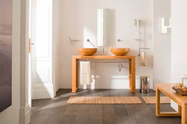 В том случае, когда в ванной комнате используется массив дерева, он должен быть обработан соответствующим образом и быть устойчивым к воздействиям влаги и температуры.