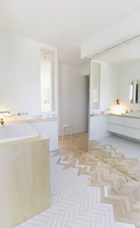 Зимняя природа — это не только снег, но и деревья. Цвет дерева делает скандинавскую ванную чуть теплее, чуть уютнее. Его оттенок должен быть довольно нейтральным. Обычно именно в таком цвете выбирают мебель для скандинавской ванной. Чтобы древесной теплоты было побольше, можно взять для пола (и не только) плитку под дерево.