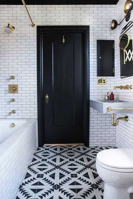 - сочетание черного и белого – это бессмертная классика. Комбинация тонов создает контраст и при этом придает интерьеру изысканный вид. Такое сочетание хорошо смотрится с древесной отделкой стен и латунной сантехникой.