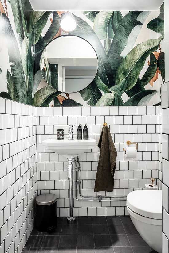 Как уже было сказано, в аутентичных скандинавских санузлах плитка является фаворитом. Но встречаются и крашеные поверхности. И даже оклеенные обоями.