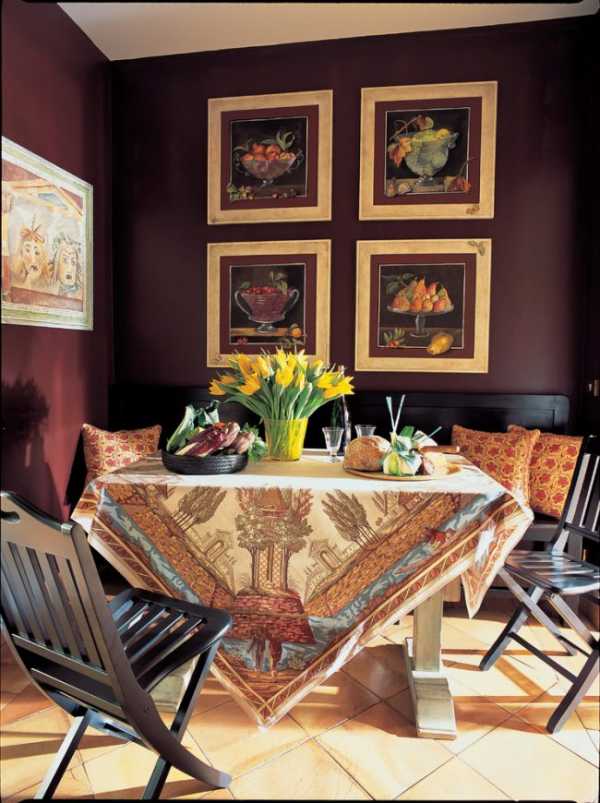 Выбирая скатерть, следует обратить внимание на окраску ткани. С монофоническими материалами проблем не возникает: они легко вписываются в интерьер, в котором присутствует подобная цветовая гамма.
