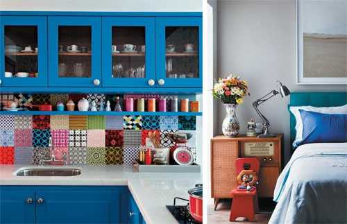 Особого внимания заслуживает кухня, где «марокканский» фартук из небольшой плитки неповторимых цветов и узоров, сочетается с невероятно синей кухонной мебелью и черным холодильником. Это красочное и стильное сочетание цветового безумия наполняет помещение кухни неповторимым очарованием.
