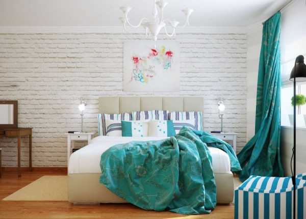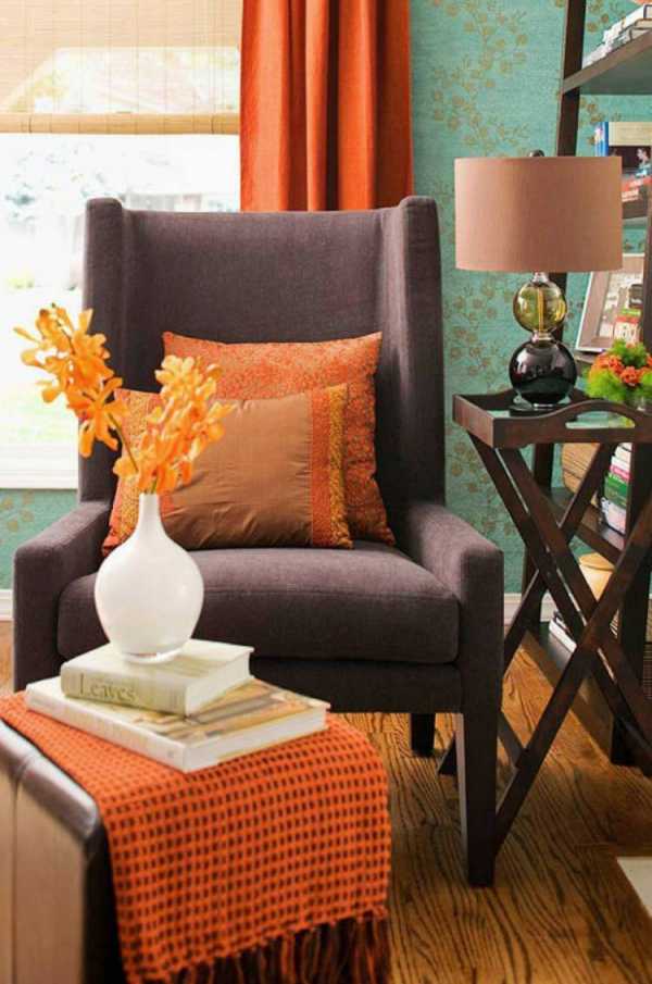 В нашем случае он придется на диван, шкаф и кресло. Компаньоном к нему будет нежная бирюза на стенах. А в качестве акцента используйте оранжевые подушки и шторы. При этом на полу появится нежная ириска в виде паркета. А вишенкой на торте будет мятная или горчичная зелень в виде неброского букета.