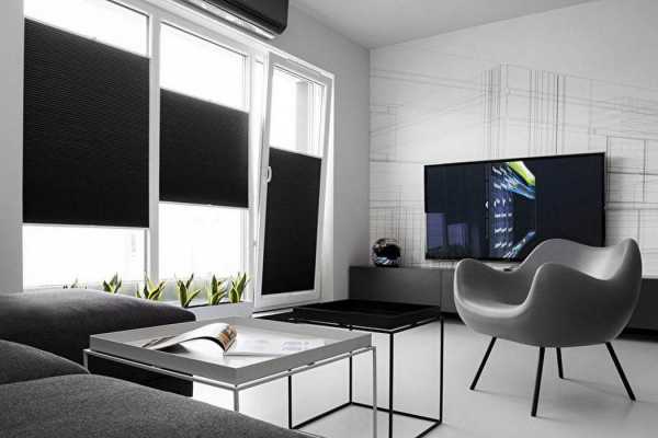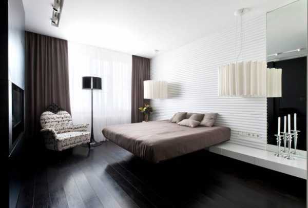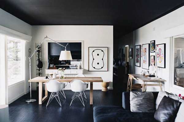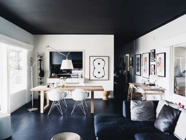 Обратная ситуация: высокие потолки в вашей комнате вызывают у вас не столько чувство уюта, сколько некоторую озадаченность по поводу общего дефицита жилой площади. Убрать этот давящий на психику эффект сплюснутости поможет параллельное оформление пола и потолка в единый черный цвет, а стеновых поверхностей — в классический белый.