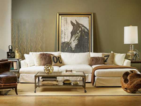 - Примерно та же гамма, но для гостиной в другом стиле — тут вместо зеленого черные детали, что придает больше «холодности» обстановке