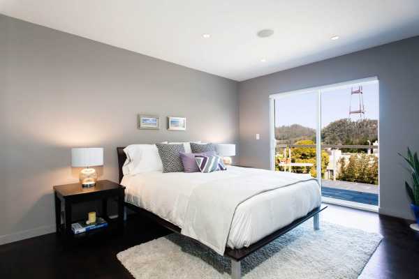 На фото выше по такому принципу сформирован интерьер спальни. Светло-серый в них — основной, два более насыщенных оттенка — дополнительные. В качестве акцентов используются в одном случае синий (комплиментарные оттенки) , в другом — пастэльные розовые.